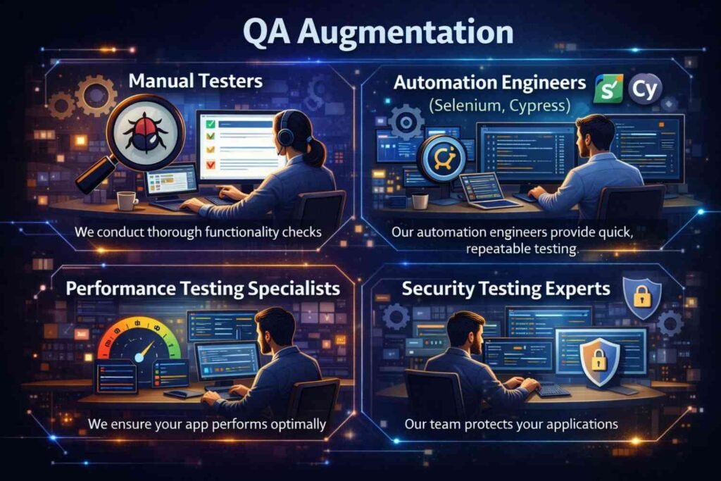 - Automation Engineers (Selenium, Cypress): Our automation engineers provide quick, repeatable testing to accelerate development cycles and improve efficiency.