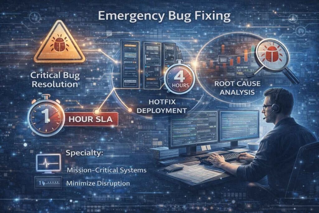 We provide the best emergency bug fixing services for critical systems, ensuring rapid resolution when bugs disrupt your operations. Our services come with a strict SLA to minimize downtime and get you back on track fast.