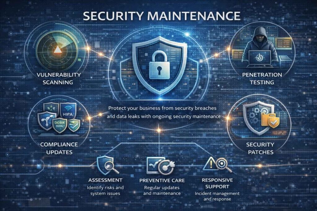 - Compliance updates for regulations like HIPAA, GDPR, and PCI DSS.